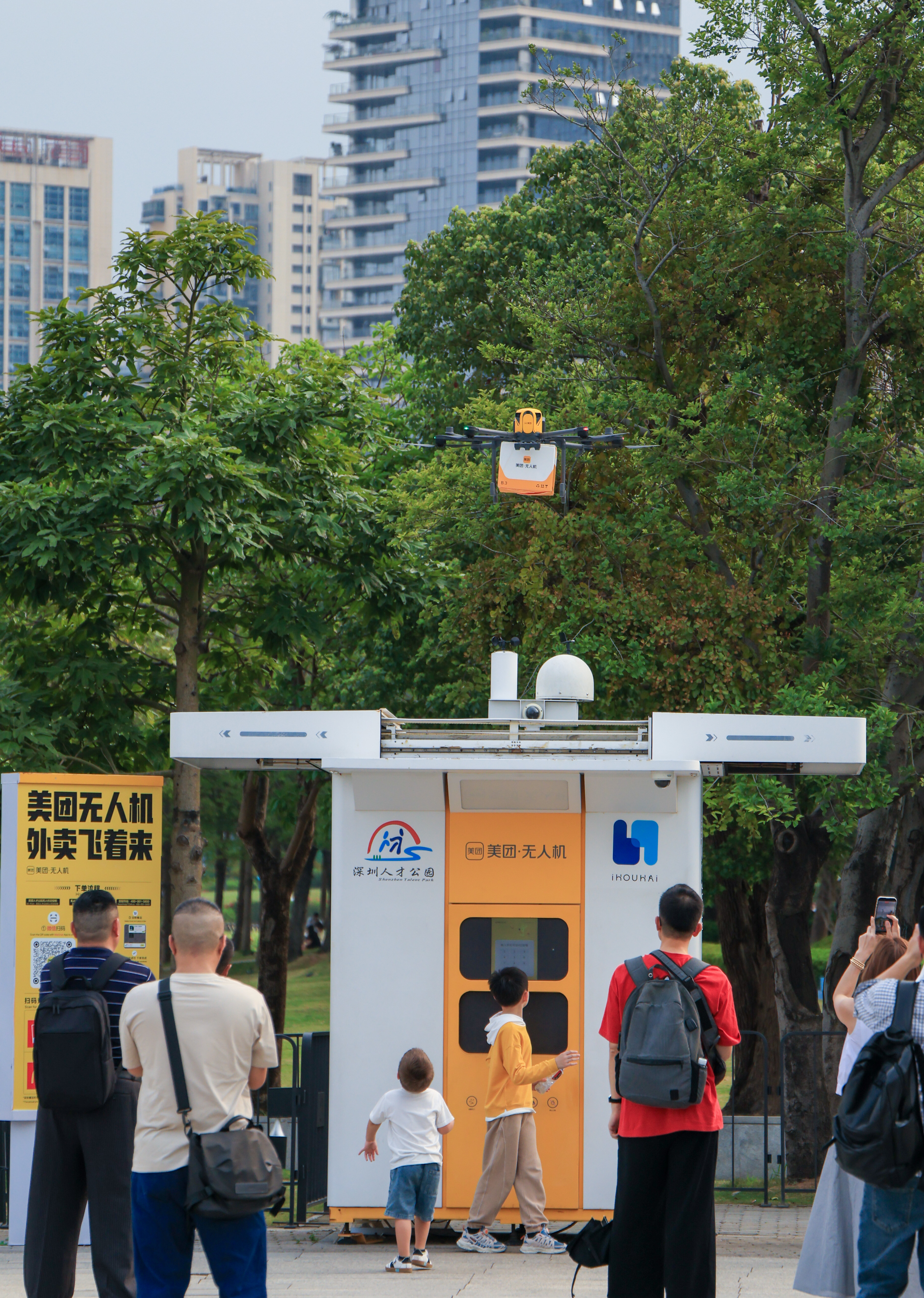 4月1日,游客在深圳人才公园等待外卖无人机派送餐饮。